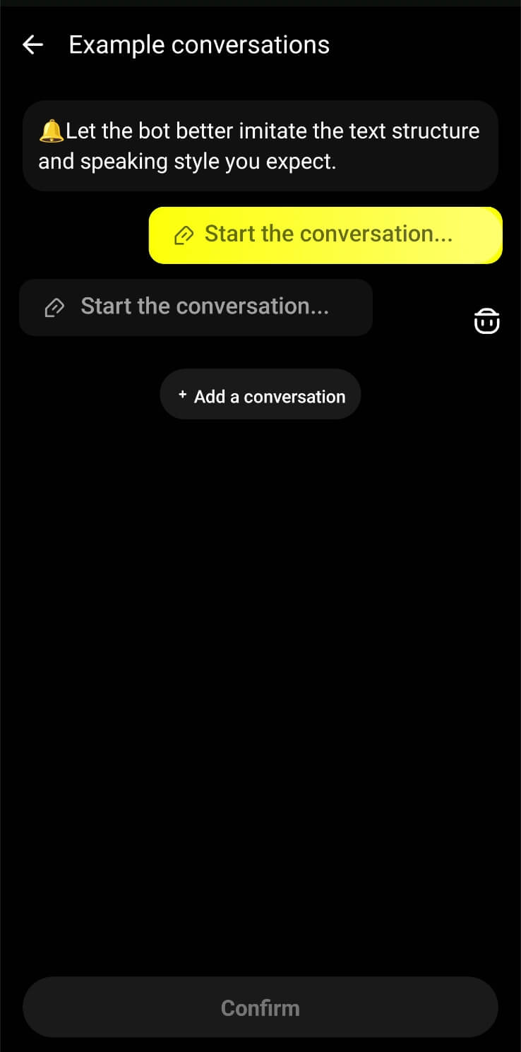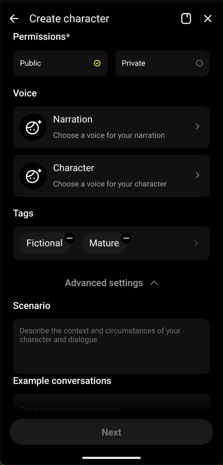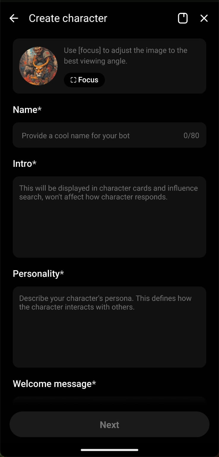 On this page, you'll bring your character to life, shaping them from 0 to 1. In Expert Mode, your character starts with just an image. It's up to you to give them life! Choose their name, personality, and voice, and create their intro, welcome message, and scenario. Like a creative scholar, you'll shape your character from scratch, making them truly your own.